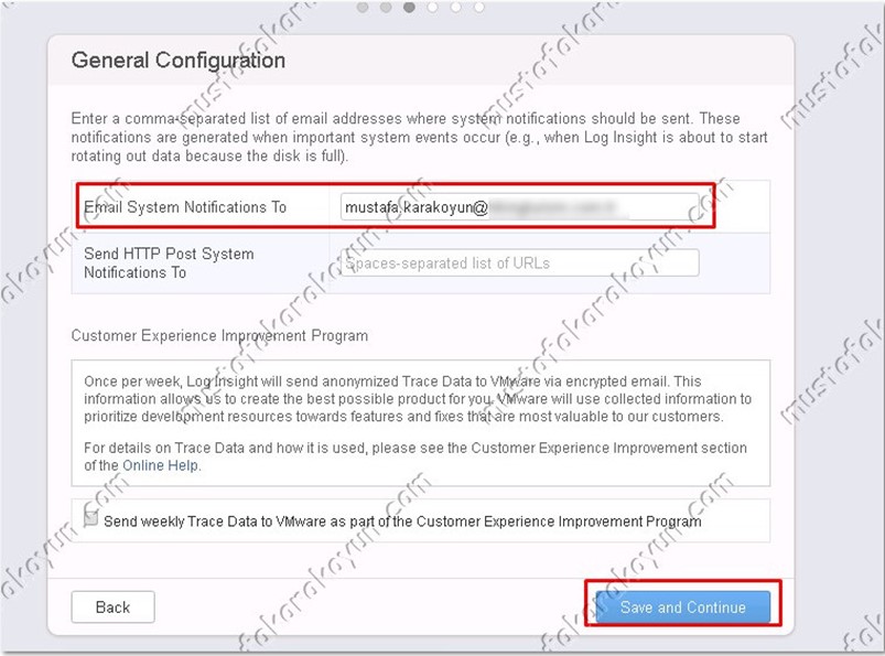 VRealize Log Insight için varsayılan NTP sunucusu seçeneğini kullanarak zamanı eşitlemek Vmware tarafından tavsiye edilen yöntemdir. Eğer external NTP server erişimi kısıtlı ise internal NTP server ya da opsiyonel olarak ESXi Host kullanılabilir. Yapınıza uygun ayarlama yapıldıktan sonra ” Save and Continue “ tıklanır.
